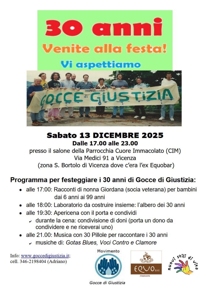 Cari soci e care socie, cari simpatizzanti, cari amici e care amiche, siete invitati a partecipare alla festa del Movimento Gocce di Giustizia 2025.